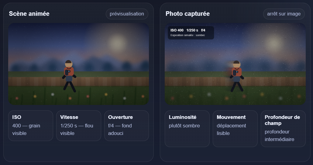 Un simulateur pour visualiser l’effet de l’ISO, de la vitesse et de l’ouverture sur l’image.