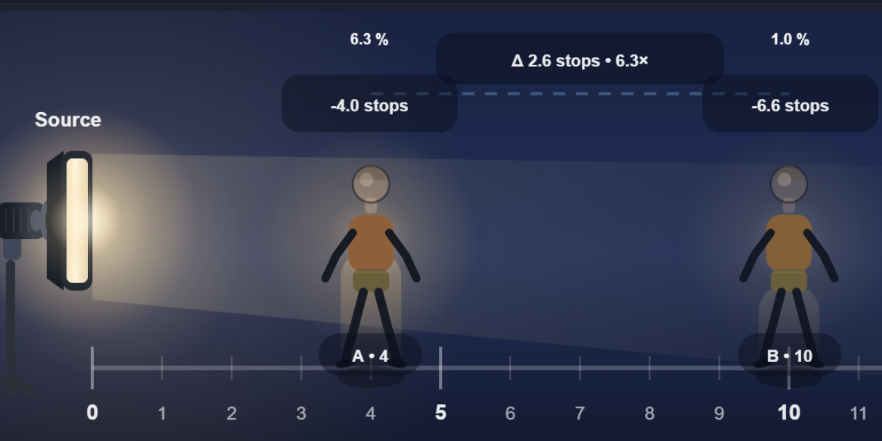 Il permet de comparer deux sujets placés à des distances différentes et de visualiser l’atténuation en éclairement relatif et en stops.